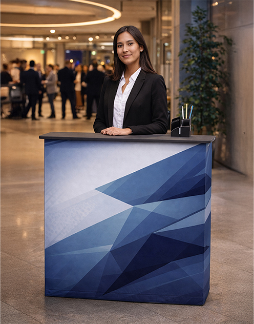 Un stand sans comptoir d'accueil, c'est une occasion manquée. Le comptoir est le premier point de contact physique avec vos visiteurs : il crée une zone d'échange, accueille vos documentations et renforce votre image professionnelle.