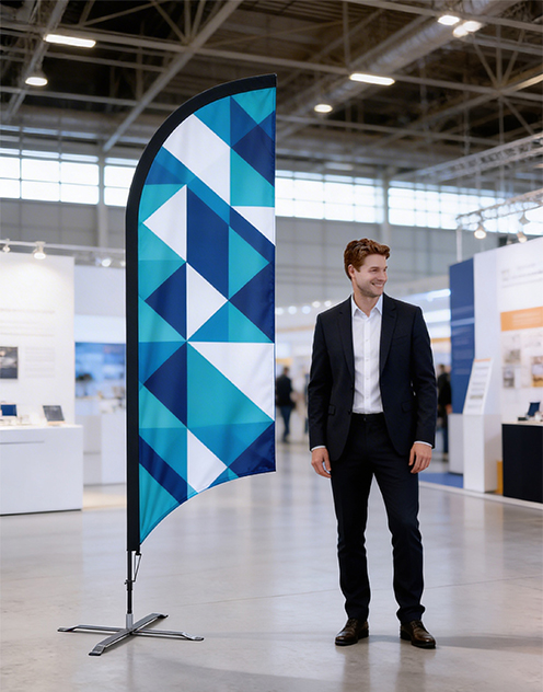 L'oriflamme est le signal parfait pour indiquer votre présence depuis l'autre bout d'un hall d'exposition. Sa hauteur et son mouvement naturel captent le regard des visiteurs en déplacement, bien avant qu'ils n'atteignent votre stand.